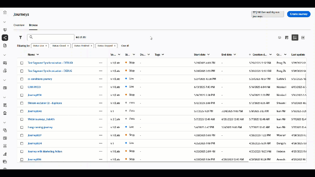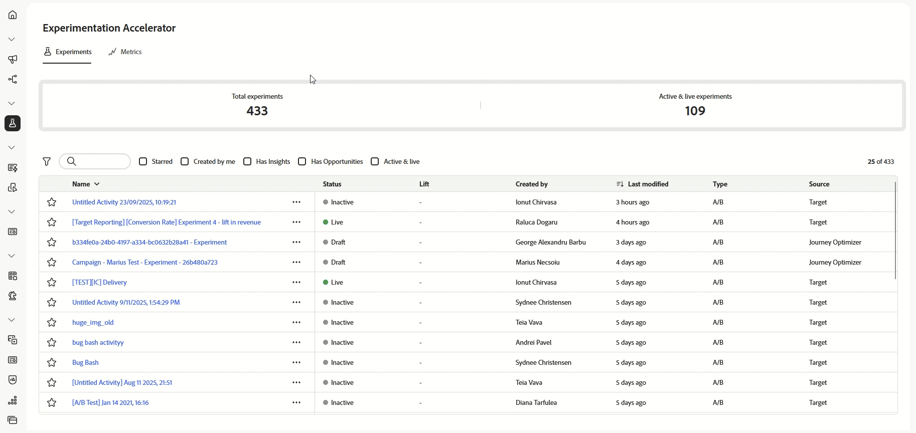 - Inventário de experimentos unificado: visualize, filtre e gerencie rapidamente todos os experimentos do Adobe Journey Optimizer e do Adobe Target em um espaço de trabalho central.