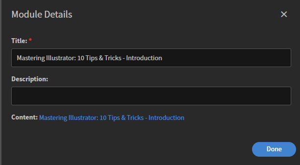 Como autor, você pode ver a descrição dos módulos enquanto adiciona o módulo a um curso.