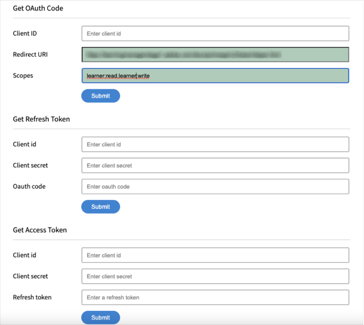 - Obter token de atualização: insira a ID do cliente e o segredo da seção anterior. Insira também o código OAuth obtido na etapa anterior. Clique em Enviar.