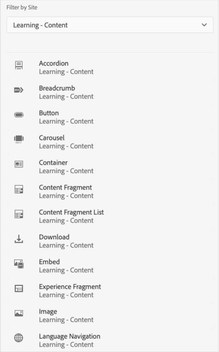 O autor do AEM poderá arrastar e soltar o componente Adobe Learning Manager e configurar adequadamente.
