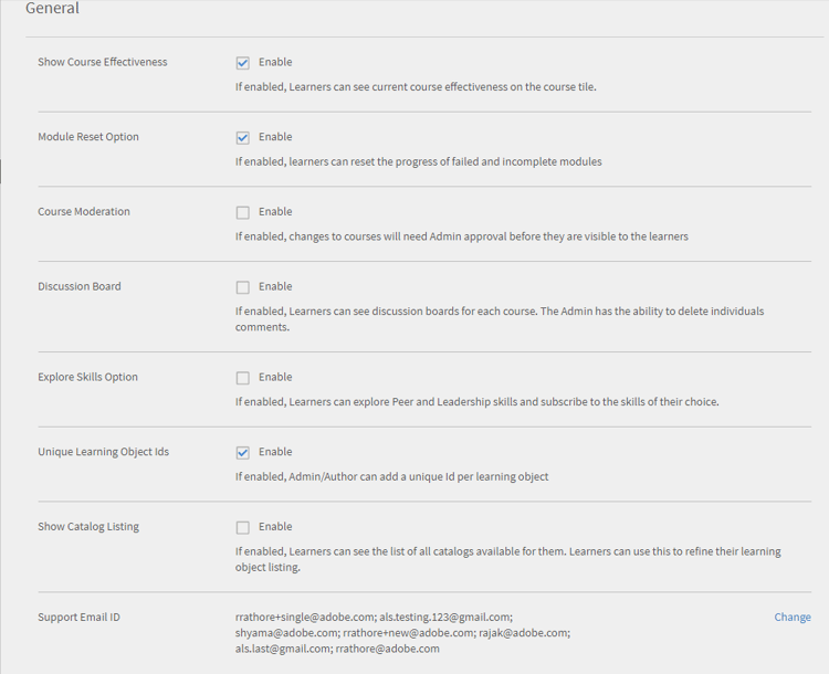 As configurações gerais no Learning Manager permitem que os administradores definam configurações genéricas que afetam outros recursos no aplicativo. Por exemplo, você pode usar configurações gerais para especificar se a eficácia do curso pode ficar visível para os alunos. Para definir as configurações gerais: