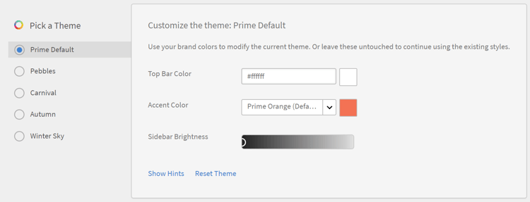 Além disso, você pode editar a Cor da barra superior, a Cor de destaque e o Brilho da barra lateral. Você pode usar suas próprias cores de marca para esses elementos essencias da interface.