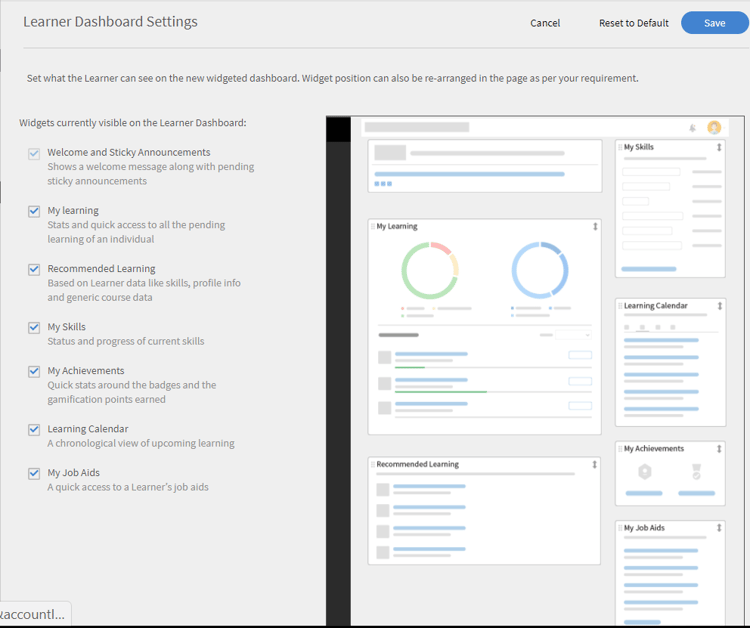 O painel do aluno no Learning Manager permite que os alunos vejam seus cursos obrigatórios e recomendados, além de suas realizações, habilidades e comunicados. Os administradores podem decidir como esse painel do aluno deve ser exibido, definindo as configurações do painel do aluno. Essas configurações permitem que os administradores definam os widgets na página do aluno. Essas configurações também especificam como e onde os widgets são colocados no painel do aluno. Como administrador, você pode visualizar o layout do painel do aluno antes de aplicar as configurações.