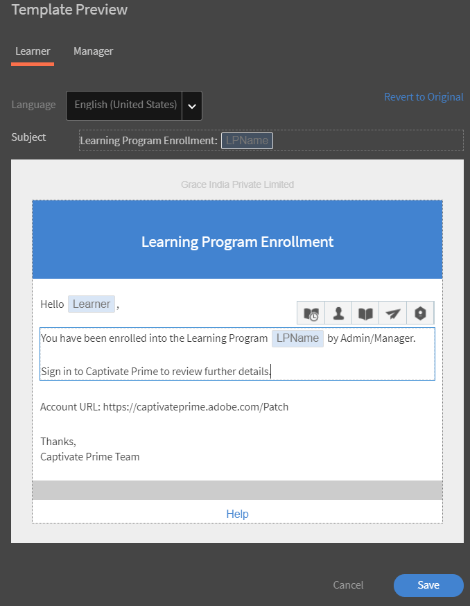 Além de configurar modelos de e-mail em um nível global, como administrador, você também pode configurar modelos de e-mail para um objeto de aprendizado específico. Nesse caso, todas as alterações feitas no modelo de e-mail são aplicáveis somente a esse objeto de aprendizado.