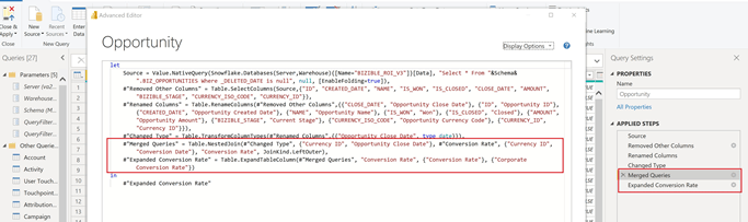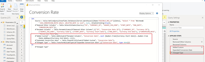 A tabela Taxa de conversão armazenada no Snowflake contém um intervalo de datas para cada conversão. O Power BI não permite critérios de associação em um cálculo (ou seja, entre um intervalo de datas). Para associar-se a uma data, adicionamos etapas à tabela Taxa de conversão para expandir as linhas até que haja uma linha para cada data no intervalo de datas de conversão.