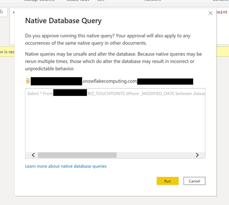 Para limitar os dados importados para o modelo, cada tabela é configurada usando uma consulta nativa como origem. As consultas nativas precisam de aprovação prévia, portanto, clique em Executar em cada consulta. Essa etapa só é necessária na primeira execução das consultas ou se houver alteração nos parâmetros.