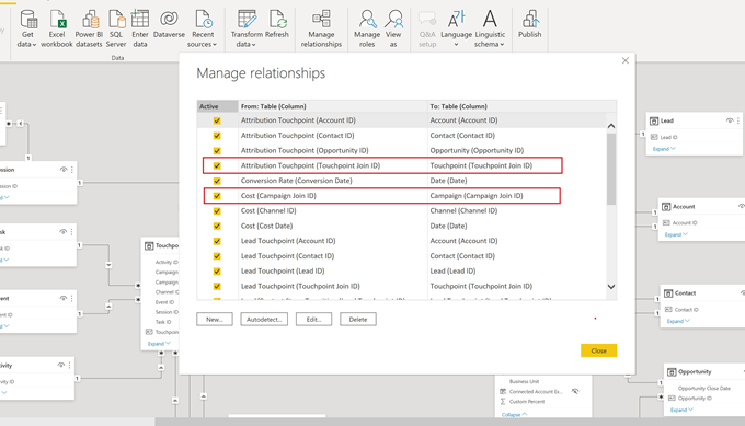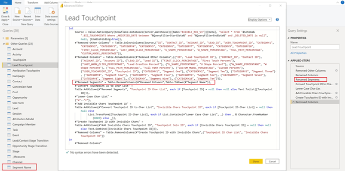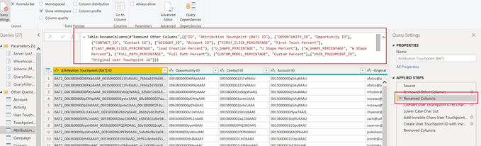 Os dados do Marketo Measure têm algumas tabelas em que os valores da chave primária (ID) fazem distinção entre maiúsculas e minúsculas, estes são: Ponto de contato e Campanha. O mecanismo de dados que orienta a camada de modelagem do Power BI não diferencia maiúsculas de minúsculas, resultando assim em valores de ID “duplicados”. Para preservar a diferenciação entre maiúsculas e minúsculas desses valores-chave, implementamos etapas de transformação que anexam caracteres invisíveis a caracteres em minúsculas, preservando a exclusividade do ID quando avaliado na camada do mecanismo de dados. Mais detalhes sobre o problema e as etapas detalhadas sobre o método que empregamos podem ser encontrados [aqui]