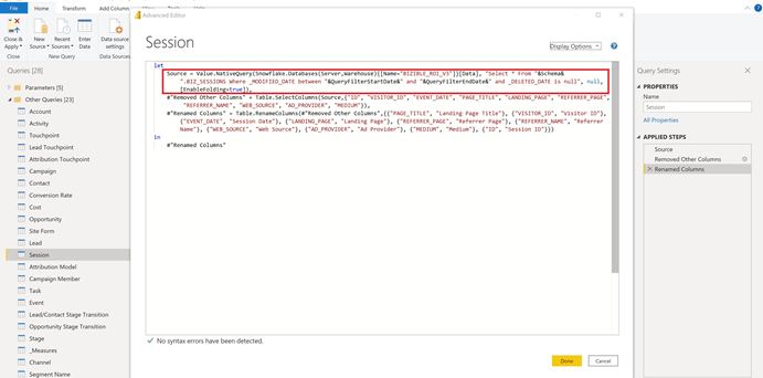 Todas as consultas filtram as linhas excluídas e as tabelas de fatos são definidas para filtrar as linhas com uma data modificada entre as datas inicial e final inseridas como parâmetros.