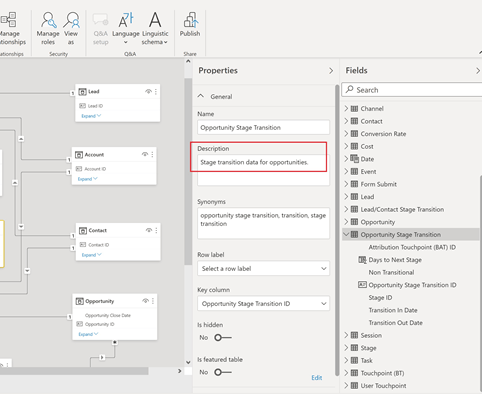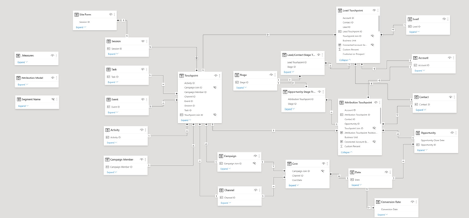 A maioria das tabelas no data warehouse do Marketo Measure contém dados dimensionais não normalizados. Trabalhamos para normalizar e limpar o modelo no Power BI o máximo possível para melhorar o desempenho e a precisão dos dados. Tenha cuidado ao incluir campos não normalizados adicionais em tabelas de fatos, pois isso pode quebrar a filtragem dimensional nas tabelas e também resultar em relatórios imprecisos.