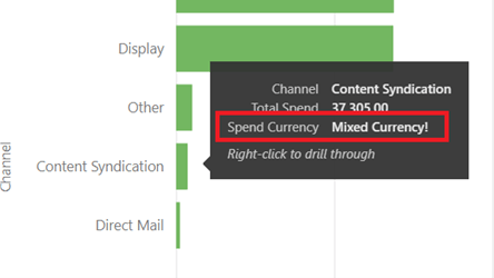 As medidas de conversão de moeda nesse modelo substituem um valor de 1,0 para a taxa se nenhuma taxa de conversão puder ser identificada. Criamos medidas separadas para exibir o valor da moeda da medida e alertar se um cálculo inclui mais de um valor de moeda (isto é, quando um valor não pode ser convertido para a moeda selecionada).