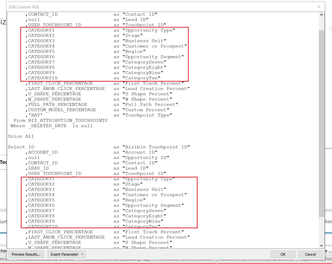Os nomes podem ser atualizados de duas maneiras. A primeira opção é atualizar o SQL personalizado. Neste exemplo, as categorias de 1 a 6 foram renomeadas com base no mapeamento da tabela Nomes de segmentos.