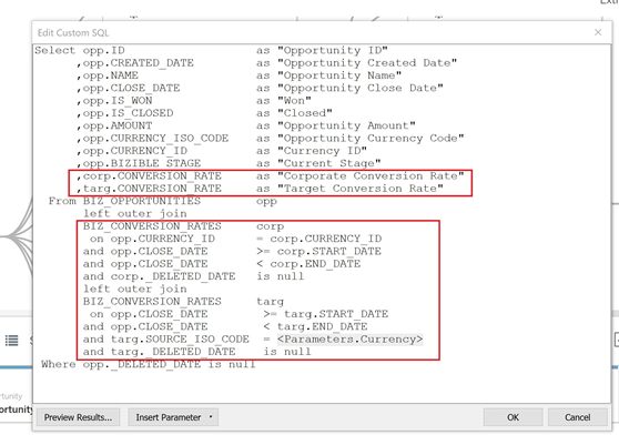 Para adicionar um recurso de conversão de moeda aos cálculos no modelo, adicionamos uma taxa de conversão corporativa e uma coluna de taxa de conversão de destino às tabelas de Oportunidade e Custo. O valor nessas colunas é adicionado no nível da linha e é avaliado associando-se à tabela Taxa de conversão na data e no ID da moeda. Como o Tableau não permite que as tabelas de fatos compartilhem mais de uma tabela de dimensão, as taxas de conversão foram adicionadas diretamente às tabelas que as utilizam. Para obter mais detalhes sobre como a conversão de moeda funciona neste modelo, consulte a seção Conversão de moeda nesta documentação.