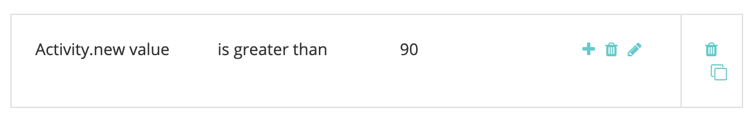 Para cada Tipo de atividade, você deve definir uma ou mais regras que determinam quais registros são qualificados para pontos de contato. Neste exemplo, adicionamos uma regra para o tipo de atividade "Alterar pontuação" para que o sistema crie um ponto de contato quando uma pessoa do Marketo atingir uma pontuação de 90 ou superior.