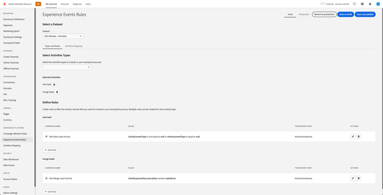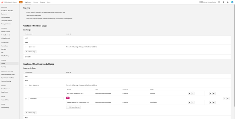 Todas as regras do Marketo Measure Ultimate são específicas do conjunto de dados. As regras do Mapeamento de estágio devem ser criadas para todos os conjuntos de dados e todos os estágios selecionados.
