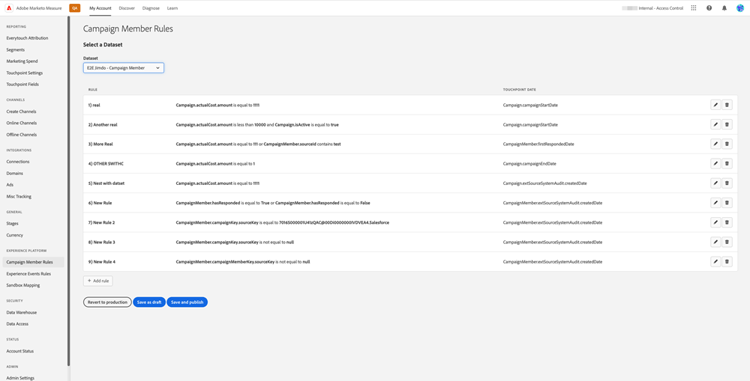 As regras de ponto de contato do membro da campanha e as regras de ponto de contato da atividade são específicas para o conjunto de dados.