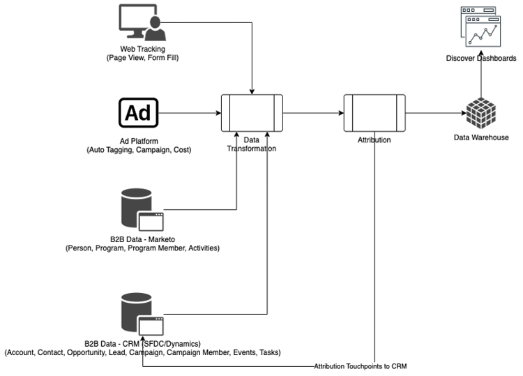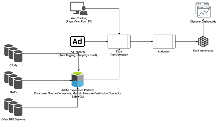 Integração com a RTCDP (Edição B2B ou B2P), fornecendo uma solução de atribuição B2B integrada para clientes da RTCDP como RTCDP e Marketo Measure. Ambos funcionam a partir de dados centralizados da Adobe Experience Platform (AEP).
