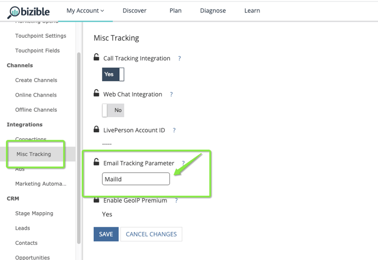 Por fim, em Marketo Measure, você deve especificar o parâmetro de rastreamento para que Marketo Measure possa localizar o valor do email ou da ID. O padrão é "mailId", como mostrado nos exemplos acima e na captura de tela abaixo. Insira o valor em suas Configurações em Marketo Measure e clique em Salvar.
