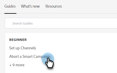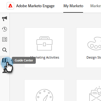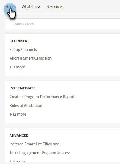 O Centro de guias tem duas abas: Guias e Novidades. Os guias servem como apresentações rápidas de recursos populares no Marketo Engage. Clique no guia desejado ou procure um específico.