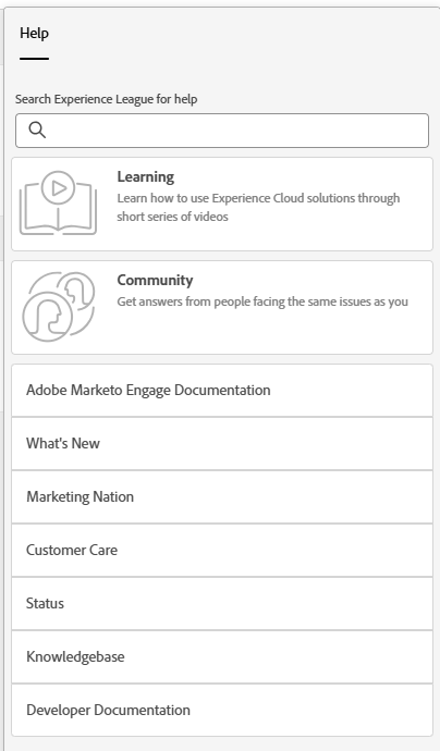 A Central de ajuda do Adobe Marketo Engage serve como um local centralizado para obter assistência. Além de estar vinculada a vários recursos (por exemplo, documentações de produto, informações de lançamento, comunidade da Marketing Nation), é possível acessar tutoriais úteis sobre o produto, organizados por nível de experiência.