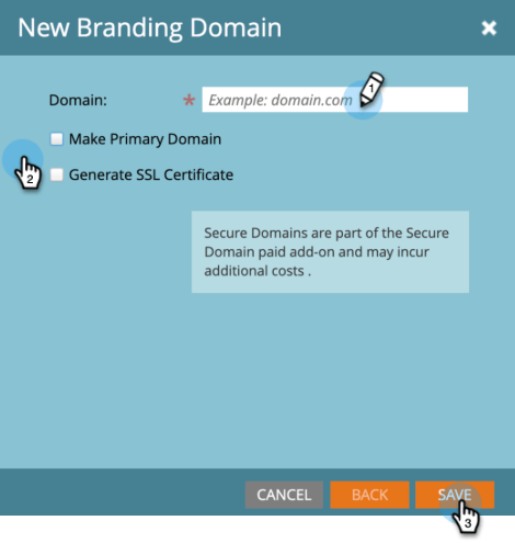 Insira o nome do novo domínio de marca, selecione Tornar Domínio Primário e/ou Gerar Certificado SSL (ambos opcionais) e clique em Salvar.