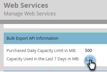 Role para baixo até o cartão Informações da API de exportação em massa. Clique no número ao lado de "Últimos 7 dias" para ver o uso por dia/usuário da API.