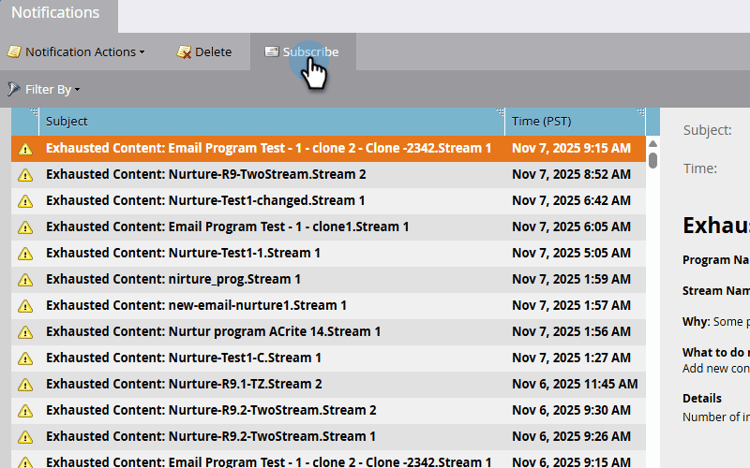 As notificações o mantêm atualizado sobre os eventos do sistema que ocorrem na sua assinatura do Marketo Engage. Por exemplo, as notificações de falha de campanha informam sobre erros nas Campanhas inteligentes, e as notificações de sincronização de CRM alertam sobre problemas críticos encontrados com a sincronização de CRM (como permissões incorretas ou a inatividade da sincronização).