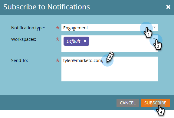 Selecione o Tipo de notificação e o Workspace. Insira o endereço de email para o qual você deseja enviar notificações (é possível adicionar mais de um, separado por vírgula). Clique em Assinar quando terminar.