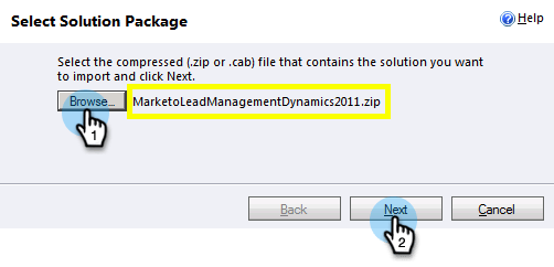 Clique em Procurar. Selecione a solução de gerenciamento de clientes potenciais da Marketo que você baixou. Clique em Avançar.