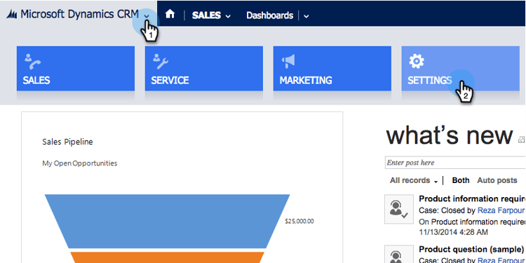 Faça logon em Dynamics. Clique no menu suspenso Microsoft Dynamics CRM e selecione Configurações.