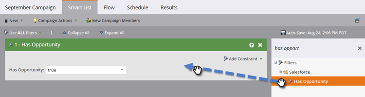 Na sua Smart List, arraste sobre o filtro "Tem Oportunidade" e defina como Verdadeiro.