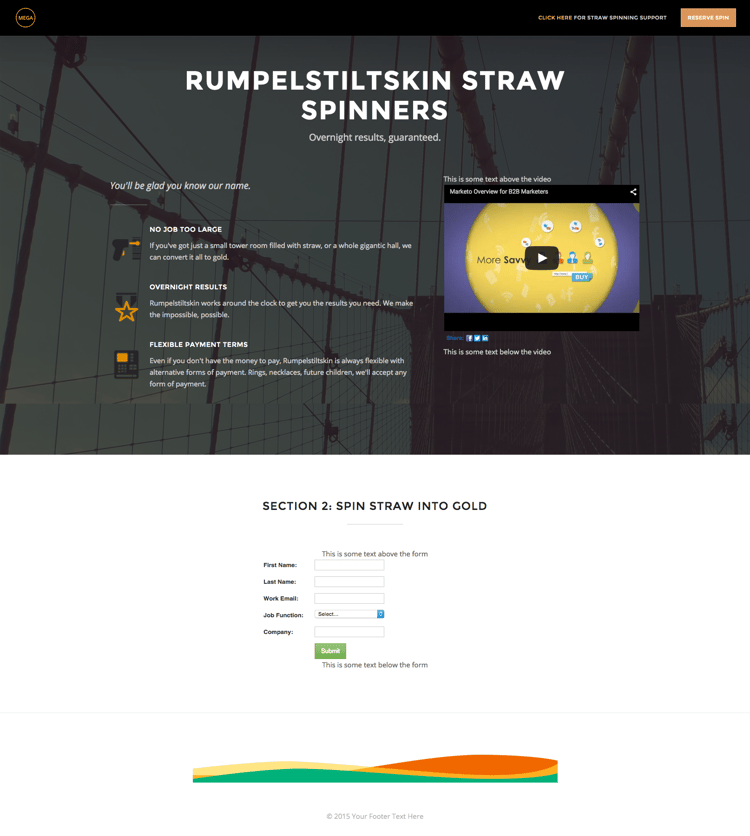 - inclui imagem de fundo herói, cabeçalho, slogan, lista com marcadores e vídeo.