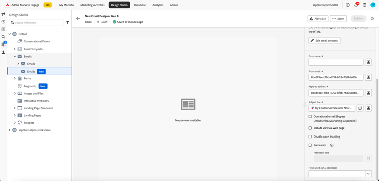 Quando um email for criado usando a Nova Designer de email, insira uma linha de assunto temporária.