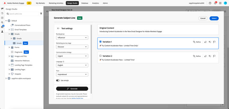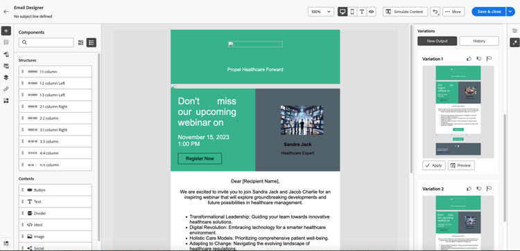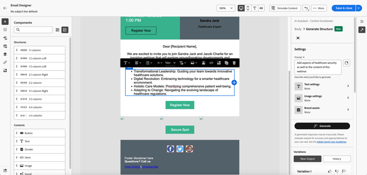 O Assistente de IA no Marketo Engage Email Designer ajuda você a criar e-mails contemporâneos, com desempenho e intuitivos. Isso é feito por meio da tecnologia de IA gerativa da Adobe e da biblioteca de prompts, juntamente com o Firefly, para geração de imagens, que auxilia na criação de conteúdo adequado para um determinado grupo de persona/compras, estágio de jornada de marketing, estratégia de comunicação, tom etc. Ativos de marca específicos também podem ser utilizados para criar conteúdo.