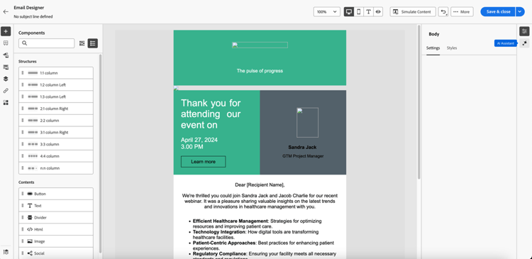 Selecione um modelo, sem selecionar nenhum componente no modelo, e clique no botão Assistente de IA no Designer de email.