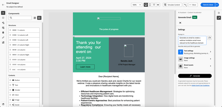 Insira o prompt relevante e escolha as configurações de texto, os ativos de marca e qualquer configuração de imagem desejada para seu email.