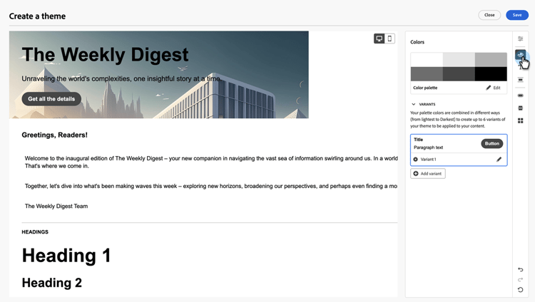 - Para qualquer componente criado nesse ativo, você pode aplicar qualquer uma das opções de estilo disponíveis no tema da guia "Estilos" no painel direito (por exemplo, um call-to-action pode ser configurado como primário/secundário/terciário).