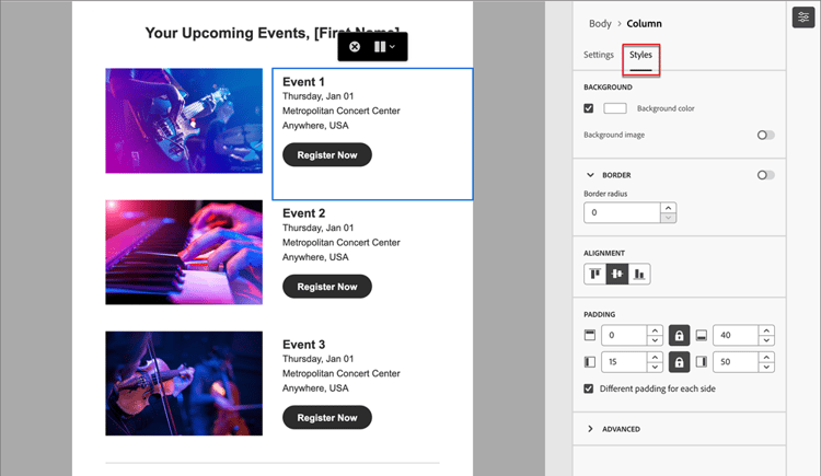 Para editar as propriedades da coluna, clique na guia Estilos à direita e altere-os de acordo com suas necessidades:
