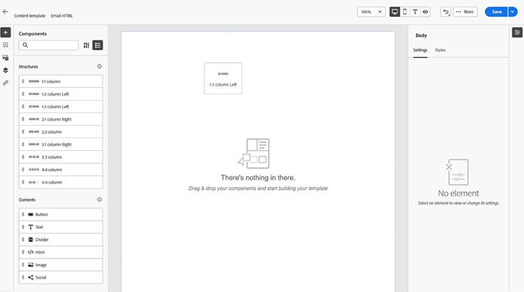 Ao começar do zero no editor de email, use as opções abaixo para definir seu conteúdo.