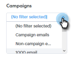 Filtros de acordo com a atividade de email enviada. Você pode escolher exibições/sem exibições, cliques/sem cliques e/ou respostas/sem respostas.