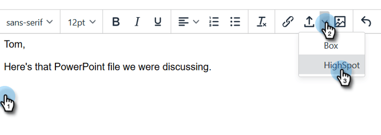 Clique no local do email em que deseja inserir o conteúdo Highspot. Clique na lista suspensa de setas (ao lado do ícone de anexo) e selecione Ponto de destaque.