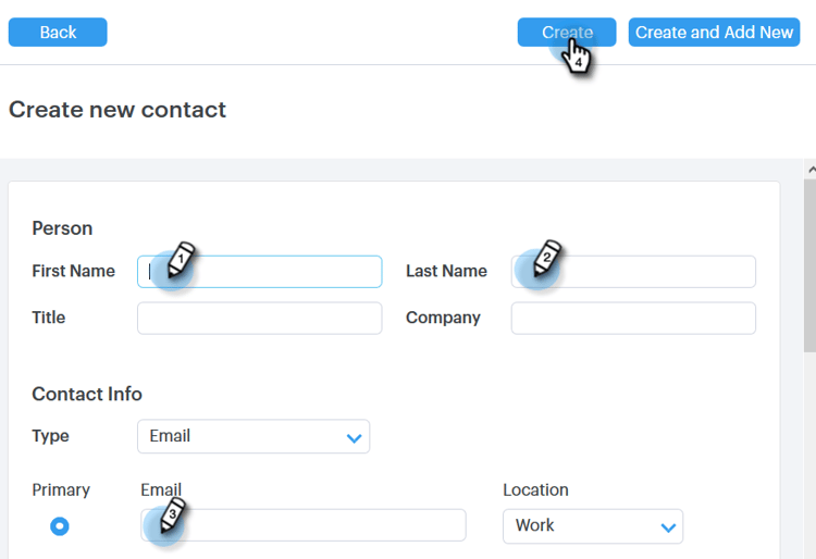 Preencha as informações do contato e clique em Criar (ou Criar e Adicionar Novo para adicionar outro).