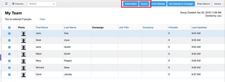 Quando você seleciona um ou mais contatos da página Pessoas, os botões de autorização e Source são exibidos no contêiner superior. Usando esses botões, você pode definir a Autorização ou Source de vários contatos simultaneamente.