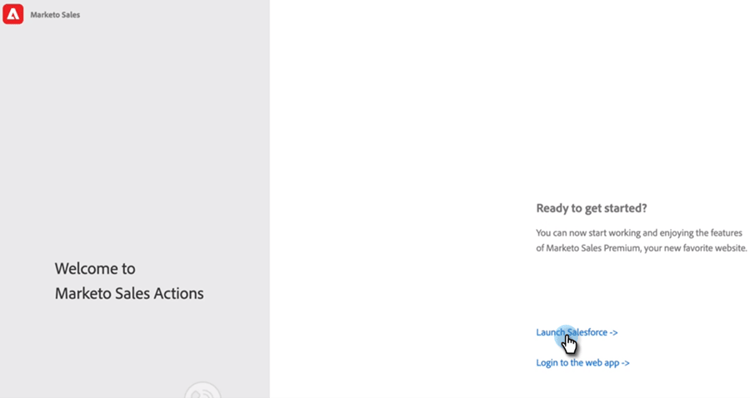 Quando terminar o tour, ou se o tiver ignorado, escolha se deseja fazer logon diretamente no aplicativo Web ou na conta do Salesforce, onde é possível acessar todos os recursos no painel MSI (neste exemplo, estamos escolhendo Iniciar o Salesforce).