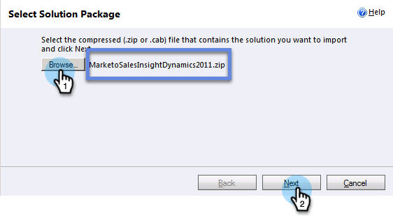 Clique em Procurar. Selecione a solução Marketo Sales Insight que você baixou. Clique em Avançar.