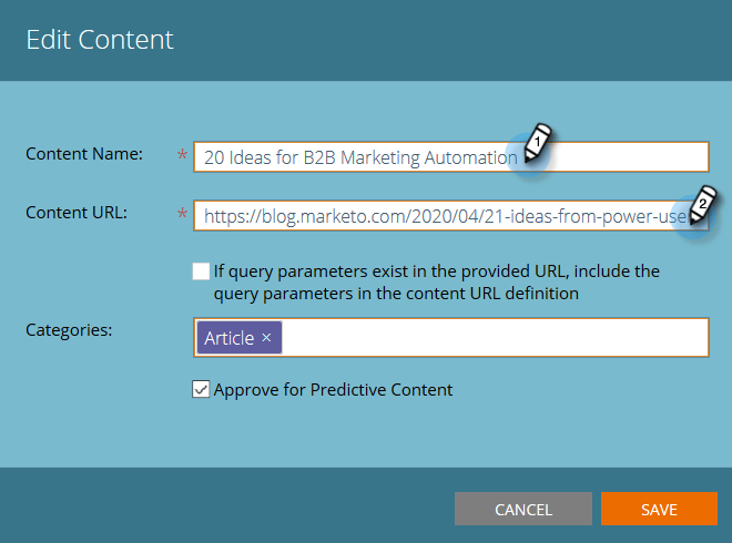 Faça alterações no Nome do Conteúdo e na URL do Conteúdo (a caixa de seleção de parâmetros de consulta é opcional).