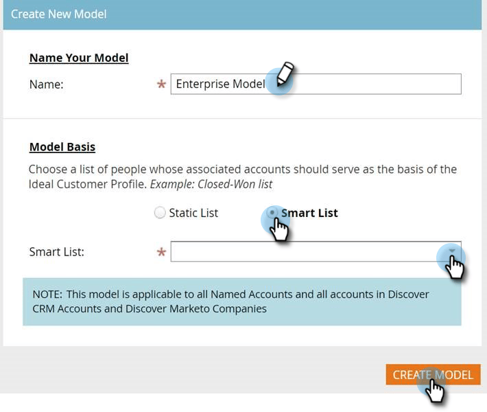 Dê um nome ao seu modelo e escolha o tipo de lista/lista de pessoas que servirão como base para o Perfil de cliente ideal (ICP). Clique em Criar Modelo quando terminar.