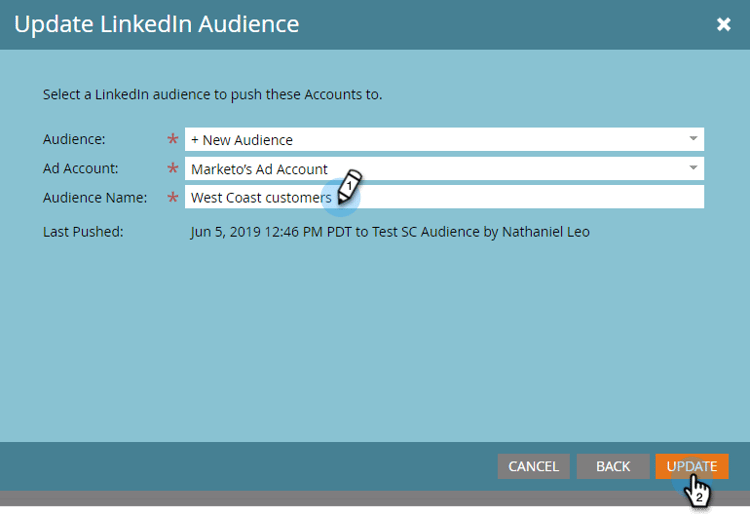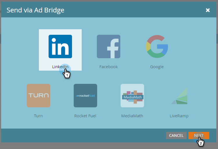 Crie públicos-alvo correspondentes à conta nas suas Listas de contas do TAM para LinkedIn Direcionamento de anúncios. LinkedIn corresponderá a lista às Contas em seu sistema, e você poderá criar um Público-alvo LinkedIn com base nessa Lista de Contas para ativar em LinkedIn canais. Isso permite que os profissionais de marketing direcionem pessoas dentro ou fora do banco de dados.