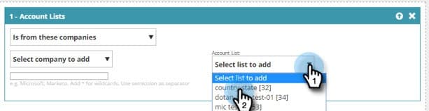 note note NOTE As listas de contas são sincronizadas do ABM para o Web Personalization para uso na segmentação. Selecione-os no menu suspenso. A sincronização pode levar até cinco minutos. Ele só será sincronizado se houver uma ou mais contas nomeadas na lista de contas. -