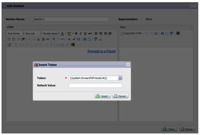 Para incluir um convite Encaminhar para Amigo no email, abra-o no editor e insira o token {{system.forwardToFriendLink}}.