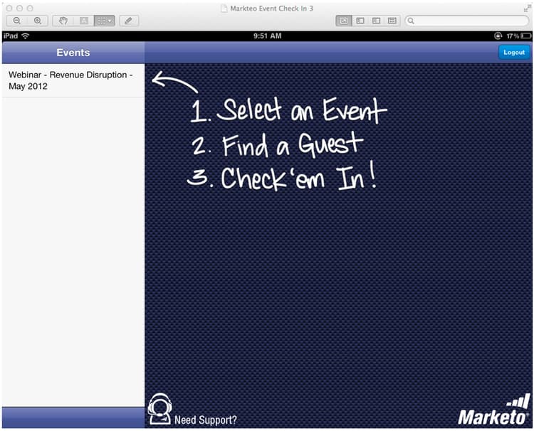 Simplifique o processo de check-in do evento usando nosso novo aplicativo iPad. O aplicativo Event Check-in é sincronizado com o programa Marketo e permite que você faça inscrições em um evento com facilidade, bem como adicione novos leads dinamicamente.